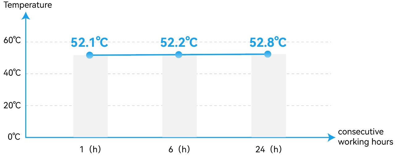 *Under the same operating conditions at room temperature (25 °C), the eRob80F_V4 reaches temperatures of 52.1 °C, 52.2 °C, and 52.8 °C after 1, 6, and 24 hours of continuous operation, respectively — rising only ~1 °C over 24 hours.